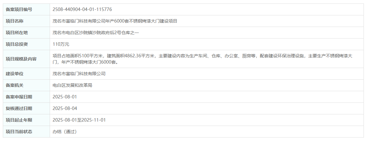 2025年8月4日,茂名市富臨門科技有限公司年產(chǎn)6000套不銹鋼烤漆大門建設(shè)項(xiàng)目備案復(fù)核獲通過。